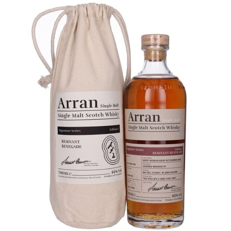 Un început promițător. Arran Remnant Renegade deschide Signature Series, o colecție ce sărbătorește pasiunea și diversitatea single maltului Arran. Această primă ediție dezvăluie o selecție rafinată de butoaie rare – ex-Sherry Hogsheads, ex-Sherry Butts și ex-Bourbon Barrels – maturate cu grijă la Lochranza. Rezultatul? Un whisky catifelat, echilibrat și plin de surprize aromatice.